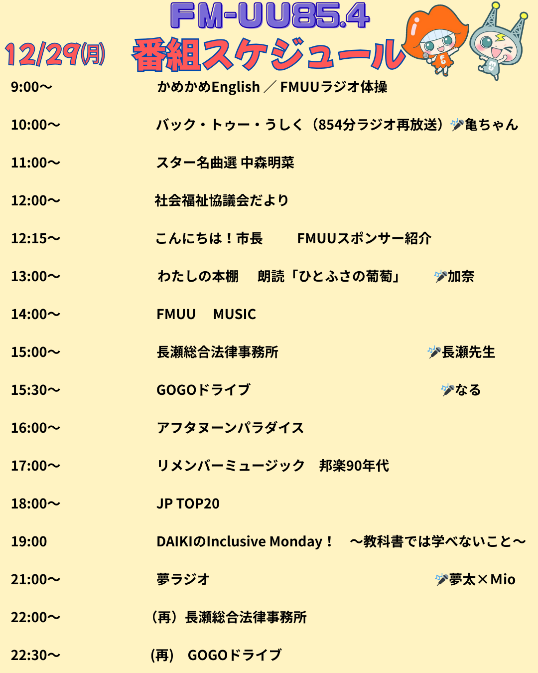 FMうしくうれしく放送(愛称:FM-UU)は、茨城県牛久市から周波数85.4MHzで放送中のコミュニティFM放送局です。 番組情報 番組予告 FM-UUを聴く お知らせ HOME > お知らせ,番組予告,番組情報 > 年末番組のお知らせ【12/29㈪】 年末番組のお知らせ【12/29㈪】 みなさ~ん!メリークリスマシュでしゅ~🎄✨FUちゃんだよ~♪ 2025年も残り6日!ということで 年末年始の番組表が出来上がったようでしゅ🙌 2025年内は854分ラジオでの「バック・トゥー・牛久」の再放送や朗読、寄席、 FMUU と一緒に年越しができる特別番組!! 年末年始もFM-UU854をお楽しみに💕 « 12/25㈮夢ラジオ特別番組『X`masだよ!全員集合!チキンケーキ食べたいな~♪2025!』のお知らせ 12/30㈫の番組表のお知らせ » 検索: FMうしくうれしく放送 放送局概要 アクセス 番組審議委員会 スポンサー企業 お問い合わせ